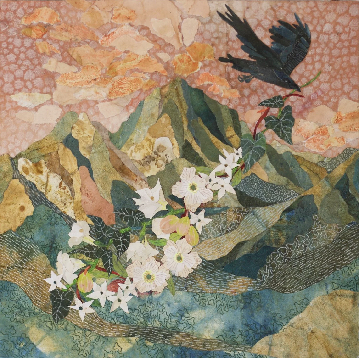 My name is Elana and I’m natural dyer and visual artist based in Tucson, Arizona making illustrative cut paper collages from naturally dyed papers dyed with local plants. I love the the process of making a collage: I create an intricate drawing and then use tiny scissors and tweezers to piece my work together. My collages reflect my internal world and I often depict mountains, deserts, and canyons as a backdrop to explore concepts most central to me. I also dye silk scarves with plants and do commissioned collages of places and concepts nearest to the hearts of my clients.