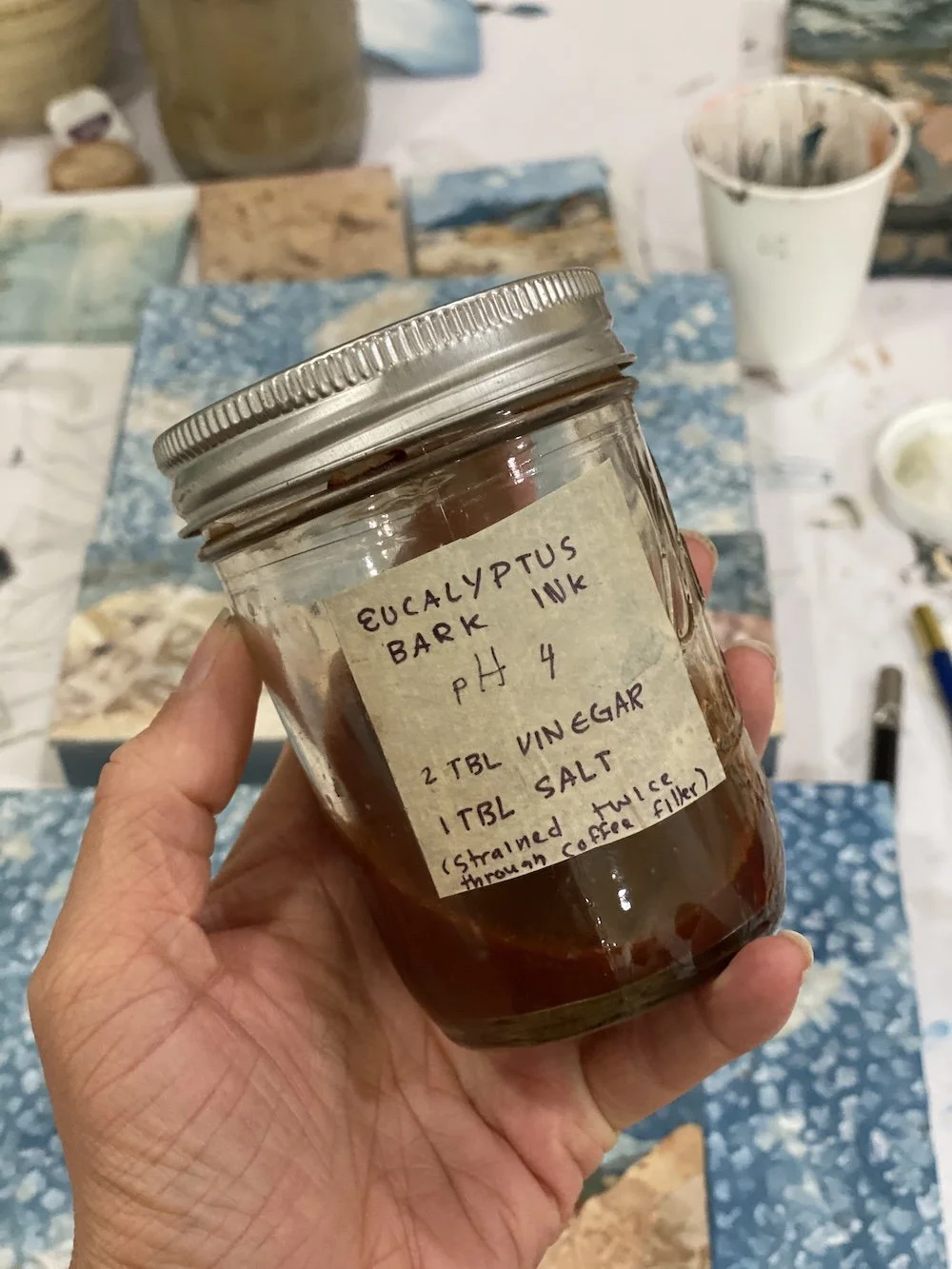 I dye a variety of types of papers with natural dyes that make in my studio. Favorites include indigo and madder.